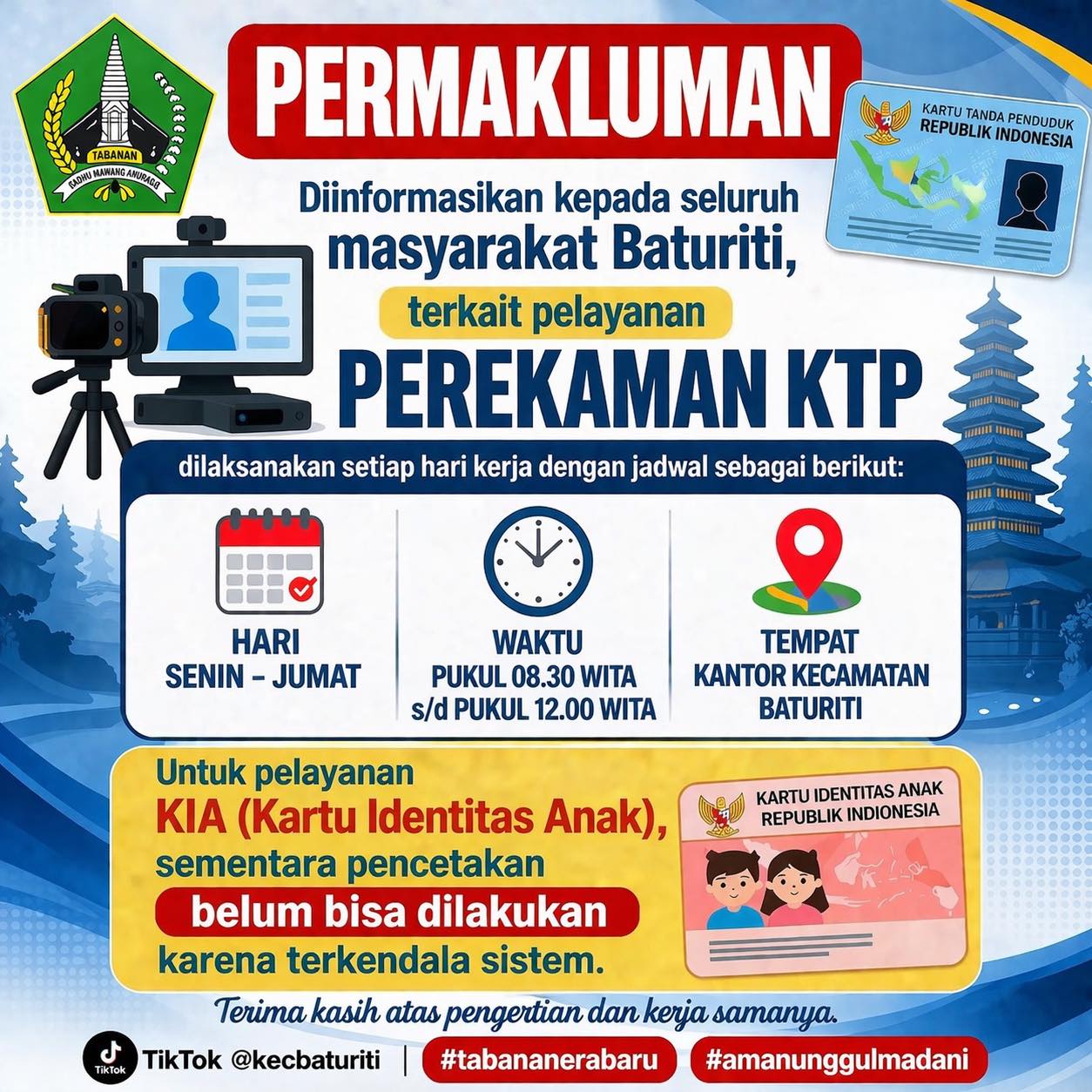 Pengumuman PELAYANAN PEREKAMAN KTP Kecamatan Baturiti 21 April 2026 Continue Reading Previous Camat Baturiti Manghadiri Oleman Di Pura Pucak SangkurNext PENILAIAN LOMBA DESA TINGKAT KABUPATEN DI DESA BANGLI More Stories Pengumuman TUGAS DAN FUNGSI KECAMATAN BATURITI Kecamatan Baturiti 29 Agustus 2023 Pengumuman DISEMINASI SP4N LAPOR BULAN JULI 2023 PADA KECAMATAN BATURITI Kecamatan Baturiti 5 Juli 2023 Pengumuman DISEMINASI ANTI GRATIFIKASI BULAN JULI 2023 PADA KECAMATAN BATURITI Kecamatan Baturiti 5 Juli 2023 Pengumuman TUTORIAL MELAPOR MELALUI “LAPOR” (LAYANAN ASPIRASI DAN PENGADUAN OMLINE RAKYAT) Kecamatan Baturiti 14 September 2022 Pengumuman LAYANAN ASPIRASI DAN PENGADUAN ONLINE RAKYAT (LAPOR!) Kecamatan Baturiti 14 September 2022 Pengumuman PEMUTIHAN BUNGA DAN DENDA PKB Kecamatan Baturiti 7 September 2022